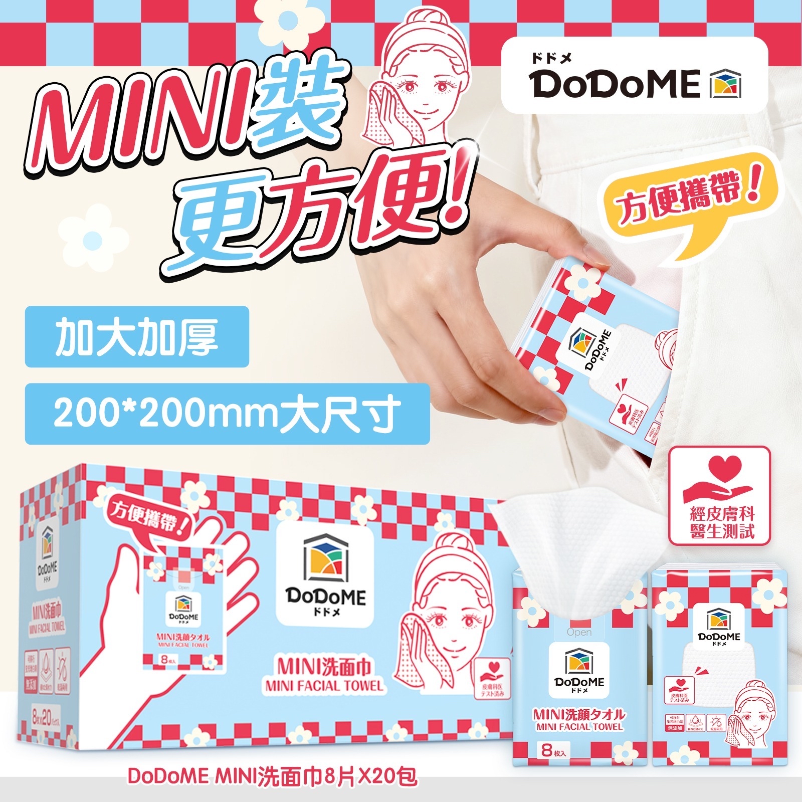DoDoME MINI洗面巾(一袋20包) ⛔截單時間:2025-11-04 💰$69/袋 📆預計到貨日: 2025-11-30 *👜MINI洗面巾 隨身帶好方便!* *✨細過銀包 輕過手機 行到邊用到邊!* 😟行李多帶毛巾好遴迍? 😥臨時清潔只能用紙巾? ✅ MINI Size|手掌大細,輕鬆放入隨身包包 ✅ 通過皮膚科測試|溫和不刺激,敏感肌適用 ✅ 雙面設計|珍珠紋深層清潔 + 平紋溫柔擦拭 ✅ 乾濕兩用|吸水力MAX,一巾滿足多種需求 🗺️ 旅行必備場景: ▸ 飛機上卸妝 ▸ 代替酒店毛巾 ▸ 運動後抹汗 ▸ BB應急清潔 ▸ 日常物品清潔 📦 貼心規格: ▸ 8片/包 x 20包入 ▸ 迷你尺寸隨身攜帶,20包盒仔裝方便儲存