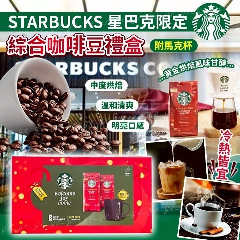 *🔥限量發售🔥STARBUCKS星巴克限定綜合咖啡豆禮盒(附馬克杯)* ⛔️截單日期:10月24日售完即止 💰$199/組 📆 ✈️📦預計到貨日期:1月頭 ☕ 限量版咖啡豆禮盒🎁 香氣與質感的完美饗宴 限量發售!不容錯過的節日限定款 💫 內含質感滿滿的325ml馬克杯 與 節日限定中烘焙咖啡豆 以 100% 阿拉比卡豆精製而成 香氣濃郁、層次豐富💕 在微微的苦韻中透出淡淡 楓糖甜香,溫潤順口、香氣縈繞😌 這份禮盒都能為日常注入一杯溫暖的儀式感🎀 限量供應,售完即止 — 喜歡就趁現在入手吧! 💝 產地:咖啡豆/越南;馬克杯/中國 規格:咖啡豆190gx2包+馬克杯x1 保存期限:2026年08月17日(商品銷售速度快,依實際出廠為主。) 保存方式:避免陽光直射,請置於陰涼乾燥。 == ⚠️ 聲明 ⚠️== 本貨品為平行進口正貨 所有帖文內容只作分享及參考用途。為免混淆視聽,所有商標或版權均屬有關商品品牌商標的持有人,敬請留意 💢 顏色或因拍攝器材或顯示螢幕等因素而與實物有異,以上資料及圖片只供參考,一切以實物為準。 由於廠商更換包裝或不會另行通知我司,而包裝並不影響內容物及其品質與使用體驗,因此恕不因包裝與圖片資料不一而作出退換。 💢貨品在運輸途中導致產品包裝外盒有任何損毀凹陷,但不影響其產品本身食用/使用,或有機會不預設外盒出貨,本司不會作任何更換或退款,介意慎購! 💢外國進口貨品之貨期或受船運/空運延誤影響,恕不接受貨期延誤原因取消訂單,下單前敬請諒解