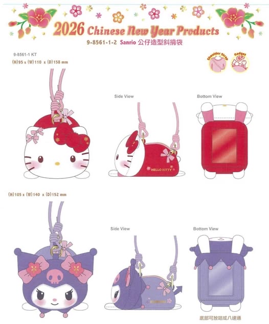 *Sanrio 2026 公仔造型斜揹袋* ⛔️截單日期:1月5日 💰$158 📆 ✈️📦預計到貨日期:2月頭 🟡兩款可選 A. Hello Kitty (9-8561-1) B. Kuromi (9-8561-2) 🌈Sanrio 💯% 正版授權‼️安心購買🫰 🌈Sanrio 新年篇利是側揹袋🧧除了可放利是和個人物品 👧🏻小朋友揹著它奔赴新年派對超可愛極了,仲可以比小朋友放八達通,好方便😍 ✨Hello Kitty Size:95 x 110 x 158 (mm) ✨Kuromi Size:105 x 140 x 152 (mm) == ⚠️ 聲明 ⚠️== 本貨品為平行進口正貨 所有帖文內容只作分享及參考用途。為免混淆視聽,所有商標或版權均屬有關商品品牌商標的持有人,敬請留意 💢 顏色或因拍攝器材或顯示螢幕等因素而與實物有異,以上資料及圖片只供參考,一切以實物為準。 由於廠商更換包裝或不會另行通知我司,而包裝並不影響內容物及其品質與使用體驗,因此恕不因包裝與圖片資料不一而作出退換。 💢貨品在運輸途中導致產品包裝外盒有任何損毀凹陷,但不影響其產品本身食用/使用,或有機會不預設外盒出貨,本司不會作任何更換或退款,介意慎購! 💢外國進口貨品之貨期或受船運/空運延誤影響,恕不接受貨期延誤原因取消訂單,下單前敬請諒解