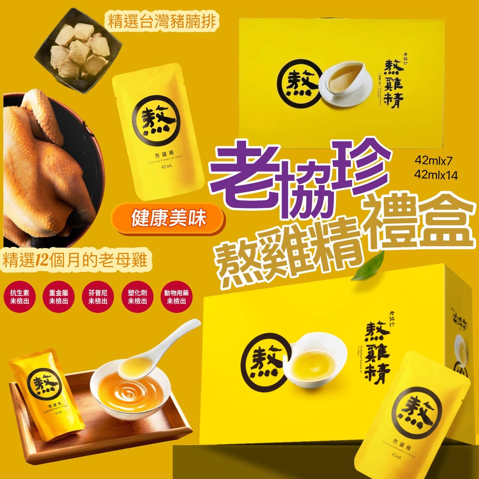 台灣老協珍熬雞精禮盒 7入 $269/盒 14入 $469/盒 截單日: 7/11 預計12月中到貨 (11月預購) 台灣老協珍熬雞精禮盒 嚴選第2代老母雞 與台灣第一大土雞廠技術合作, 嚴選育種品質優良,飼養12個月以上 第二代老母雞,營養萃取更豐富獨門複方營養更完整 秉持繁複熬製工法,並加入少許豬腩排, 萃取更豐富營養,造就多層坎的美味醇郁口感8小時慢工細熬 雞隻5倍濃縮精華 傳承八十年熬工法,以日本高溫 高壓技術,深層萃取老母雞營養健康0負擔 産品無添加味素,0膽固醇,0脂肪, 無抗生素、防腐劑、塑化劑殘留常溫保存 採用高溫高壓滅菌密封技術 完整保留營養及美味,常溫可保存18個月 方便好攜帶,即時加熱,補充完整營養日本製袋 特殊包材安全無虞 與日本知名製袋廠技術合作, 專用4層不透光材質,確保商品無塑化劑 重金屬殘留,隔水加熱更放心 成份:老母雞、豬肉 內容量:每包42毫升 注意事項: 1.痛風、高血壓及腎臟病患者飲用前請先諮詢醫師 2.二歲以下幼兒因腎臟發育未完全,不建議飲用 3.若發現產品有破損瑕疵、軟袋鼓起或拆開後有異味時請勿飲用 (圖片只供參考) 7入禮盒 (42毫升 x 7包) / 盒 14入禮盒 (42毫升 x 14包) / 盒 台灣製造 - 本貨品為平行進口貨。 - 所有帖文內容只作分享及參考用途。為免混淆視聽,所有商標或版權均屬有關商品品牌商標的持有人,敬請留意。 - 空運/海運有可能因各種不明因素影響而延誤到貨,成功訂購後,如非斷貨,不設退貨/換貨/退款,不接急單,如不能接受請勿下單。 - 貨品在運輸途中導致產品包裝外盒有任何損毀凹陷,但不影響其產品本身食用/使用,或有機會不預設外盒出貨,敝司不會作任何更換或退款。