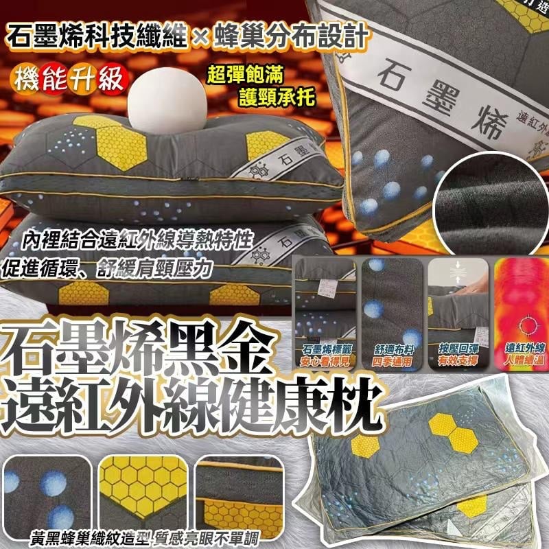 台灣🇹🇼黑金石墨烯遠紅外線健康枕 ⛔截單時間:2025-11-25 💰$79/個;2個以上$75/個 📆預計到貨日: 2026-01-18 🖤 黑金石墨烯健康枕.遠紅外線養護睡眠力 🌈🌈整顆可水洗🌈🛗 超彈飽滿|護頸承托|機能升級款 🧬 石墨烯科技纖維 × 蜂巢分布設計 內裡結合遠紅外線導熱特性,促進循環、舒緩肩頸壓力,打造深層放鬆睡感。 💛 黃黑蜂巢織紋造型 質感亮眼不單調 ✔ 高回彈填充,柔軟不扁塌 ✔ 透氣親膚,適合四季使用 ✔ 適合成人、長輩保健睡眠使用 🏷 外層布標織有「石墨烯」識別,品質安心可見。 重量:780~800g飽滿扎實,真材實料 材質:聚酯纖維(內含石墨烯 ) 尺寸:約48x75cm