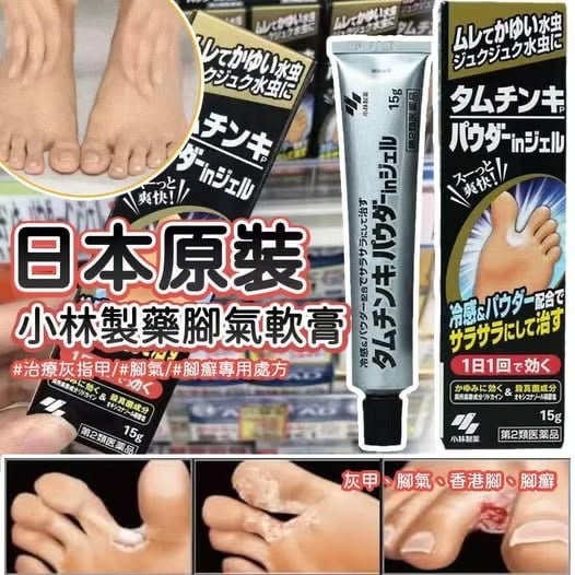 日本🇯🇵小林製藥強力腳氣膏15g ⛔截單時間:2025-11-20 💰$79/支;2支以上$75/支 📆預計到貨日: 2025-12-15 😳😳除咗鞋仲有異味?? 🙌推薦給你這款日本小林製藥強力腳氣膏 不僅可以解決很多🦵足部問題,還能有效殺菌抗菌😈,有傷口也可以幫治愈合🥰。拒絕除去鞋子的尷尬!! 🌿獨特的薄荷清涼感添加,給你帶來清涼舒適的體驗,腳氣的朋友一定要試試👍🏻👍🏻 治愈灰指甲,各種足部真菌‼️ 非常有效‼️ ✅用於治療皮膚真菌感染,如灰指甲、香港腳、蟋蟀、癬、腿癬等 ✅止癢,抑製表皮異常增生,殺滅表皮真菌和細菌,促進健康表皮生長和恢復受影響區域的皮膚像以前一樣 📝使用方法: 每日一次(嚴重過多次使用),清洗腳部,塗於患處即可 使用後👉🏻用清水和潔手液清洗雙手殘餘藥膏 產地:日本 到期日:2028年
