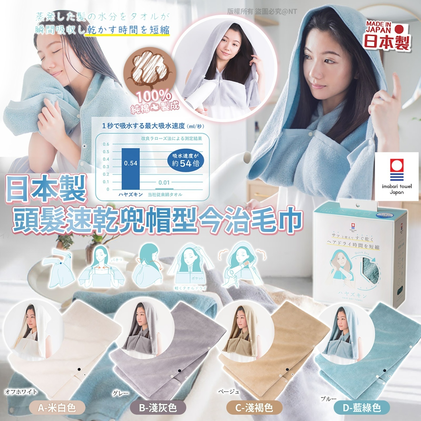 日本🇯🇵頭髮速乾兜帽型今治毛巾 ⛔截單時間:2025-11-09 💰$149/件;2件以上$145/件 📆預計到貨日: 2026-01-31 👸🏻長髮公主恩物💝日本世博會好評精選😍😍🫸🏻專為長頭髮設計的兜帽型今治毛巾 ,有效縮短吹頭時間⌛ 柔順亮麗秀髮🥰,輕鬆get到😘 🌟採用100%純棉原料☁,經加工後變成特殊紗線🧵 以嚴謹、高品質💮的今治毛巾規格織成 吸水性極高🔝,同超細纖維毛巾一樣強🤼♀ 輕輕按壓就可以🤩吸走頭髮大部分水份,達半乾狀態😶🌫 🌟毛巾加設個紐扣後,就由一條正常的長毛巾 變身成有2個口袋的兜帽型🧕🏻,頸部紐扣幫助固定毛巾 再長的秀髮可放入口袋,垂直覆蓋,👏🏻唔會再有水珠滴落 🌟呢個改變令頭髮製造½半封閉空間 空氣經風筒加熱後♨,在內部形成類似桑拿的效果🥵 熱力♨因為毛巾分佈更平均↔️,接觸範圍更大↕ 此協同效果⏱可縮短吹乾頭髮的時間,🥳同時吹乾後髮絲柔順不毛燥 🌟同一般毛巾相比,🌬佢嘅晾乾速度更快🆙 有助⛔防止細菌滋生,⤵️降低發霉 & 🤢產生異味的風險 💗日常使用更安心💗 長髮公主👸🏻要養出一頭靚頭髮💁🏻♀ 🤨用再貴嘅產品 or 工具,🤷🏻♀都唔夠用正確嘅方法重要😠 好多人都會採到嘅地雷💣——洗完頭後🙅🏻♀唔識正確使用毛巾🧖🏻♀ ❌錯誤:用毛巾搓揉濕髮 濕髮係頭髮最脆弱嘅時候,毛鱗片打開嘅狀態 若再反覆摩擦會受損 ❌錯誤:用毛巾包裹濕髮 會令頭皮處於潮濕悶熱環境 導致細菌滋生 & 損害毛囊健康,😱仲有增加脫髮危機 🚫以上動作唔該千祈‼️千祈‼️千祈‼️唔好再做吖~~ 快D轉用呢款喇🥰🥰🥰 💖温馨提示:基於衛生問題,本產品除品質問題外,其他理由一律不設退換,敬請留意! A. 米白色 B. 淺灰色 C. 淺褐色 D. 藍綠色 尺寸(約±2cm):約 32 x 145 材質:100% 純棉 產地:日本