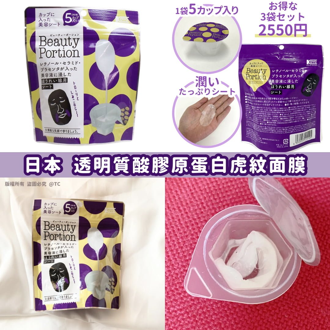 【日本製造 Beauty Portion 透明質酸膠原蛋白虎紋面膜 (一包5杯)】 ⛔ 截單時間:11月11日 💰 $89/包;2包或以上$85/包 📆 預計到貨日:11月下旬 🙈皺紋可以話係女人嘅大敵,除左保濕減紋減齡都好緊要,😻針對臉上法令紋同魚尾紋既局部面膜,👏🏻可撫平淡化細紋同暗沉 💜膠原蛋白+胎盤素及a酸等成分,質地濃稠好吸收 💙獨特單個包裝,保持保養品新鮮衛生同時都方便攜帶 🔥每一顆內都有滿滿既精華液,除左法令紋局部面膜使用外,🌸剩餘既精華液可以搽係臉頸部等部位,一齊滋潤保養 ✅含透明質酸、胎盤素、膠原蛋白及蜂王漿,有效保濕緊緻肌膚、淡化細紋🧪 ✅收緊肌膚淡化虎紋💯 ✅適合早晚使用有效改善暗沉及撫平細紋 產地:日本 規格:一包5杯,每杯2枚