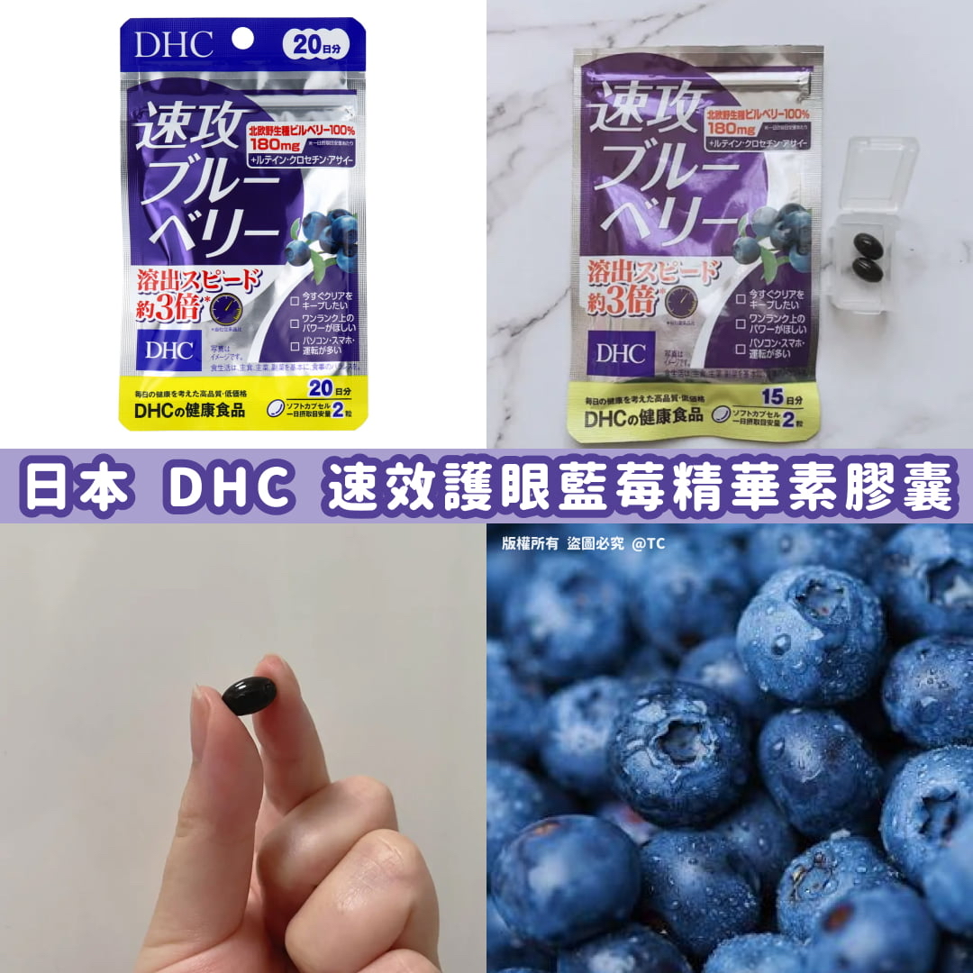 【日本直送 DHC 速效護眼藍莓精華素膠囊 (一包40粒入)】 ⛔ 截單時間:10月26日 💰 $99/包;2包或以上$95/包 📆 預計到貨日:11月中旬 如果你眼睛容易疲勞、眼乾、眼澀👀等問題,被稱為「護眼明星」嘅藍莓🫐,絕對係你最佳天然護眼食品,經臨床實證藍莓能有效過濾有害光線,免受紫外線及強光損害。加速視紫質再生,促進視力,並預防視力衰退及老花🤩 ✅使用北歐野生藍莓製成的健康補助食品😍 ✅花青素含量36%,一日份量含180mg藍莓精華,攝取量相等於540粒野生藍莓🔎 ✅新技術令產品溶出速度加快3倍,更快被人體吸收🤩 ✅添加了大量葉黃素、藏紅花以及巴西莓萃取。幫助您維持每天的健康 ✅維護視力,改善便秘問題,增進胃腸的消化能力,增強免疫力,具有抗氧化能力 ✅分解腹部脂肪,控制體重。預防泌尿道內的大腸桿菌,抑制細菌生長🦠 📍 使用方法 每日2粒,建議早晚各1粒溫水送服。 規格:一包40粒入