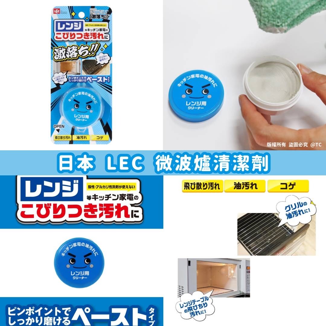 【日本製造 LEC 微波爐清潔劑 35g】 ⛔ 截單時間:12月3日 💰 $79/件;2件或以上$75/件 📆 預計到貨日:12月下旬 針對微波爐等廚房用具上的頑固污漬🔪,可以進行高精度研磨的膏狀類型 ✅針對微波爐桌上飛揚的塵埃污漬🆗 ✅針對烤架上的油漬🧼 📍 使用方法: 1. 用水把微波爐表面沾濕,除去表面的污垢和灰塵 2. 用軟布把適量的清潔劑擦拭表面 3. 然後把研磨劑擦拭乾淨 產地:日本 規格:35g