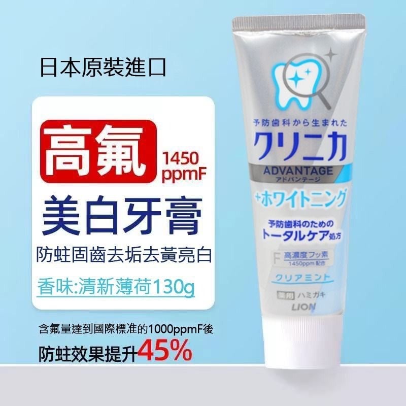 日本🇯🇵LION 獅王 CLINICA ADVANTAGE + 美白牙膏 130G(1套2支) 📆截單日期:10月22 🚚到貨日期:約11月底 $89 僅此1支即可實現「預防齒科」三大要點的全效保養。 打造更加滑順有光澤的潔白牙齒! 日本天然萃取酵素配方:日本厚生省認證,唯一有效齒垢分解酵素,幫助分解牙菌斑、去除牙漬。 ✅LSS淨澈成分:持續清新口氣,幫助去除引起蛀牙、口臭的細菌。 ✅TPP防護因子:可幫助抑制齒垢堆積形成牙結石。 ✅高密著氟素:強化琺瑯質,防蛀固齒。 產地:日本 🌟空運/海運可能因各種不明因素影響而延誤到港,如不能接受者請勿下單。