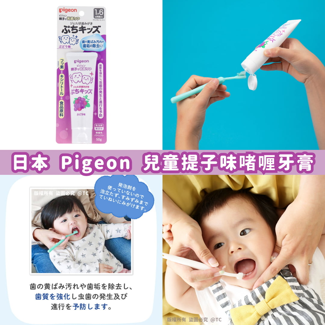 【日本製造 Pigeon 兒童提子味啫喱牙膏 50g】 ⛔ 截單時間:11月6日 💰 $79/支;2支或以上$75/支 📆 預計到貨日:11月下旬 為免對寶寶細緻的乳齒造成傷害,特別採用性質溫和的洗淨劑😍,但能有效去除不易清洗的黃斑髒污與齒垢,保持牙齒的白淨🦷,促進牙齒再石灰化以強化齒質,並配合氟化鈉成分,以預防蛀牙的發生🚫 ✅適合1歲6個月起使用👶🏻 ✅配合氟化鈉成分,以預防蛀牙的發生 ✅本產品含有木糖醇,令造成蛀牙的酸性物質不易生成💯 ✅沒有添加發泡劑所以不會起泡🫧 ✅採用食品原料為主要成分,可安心使用❤ 產地:日本 規格:50g