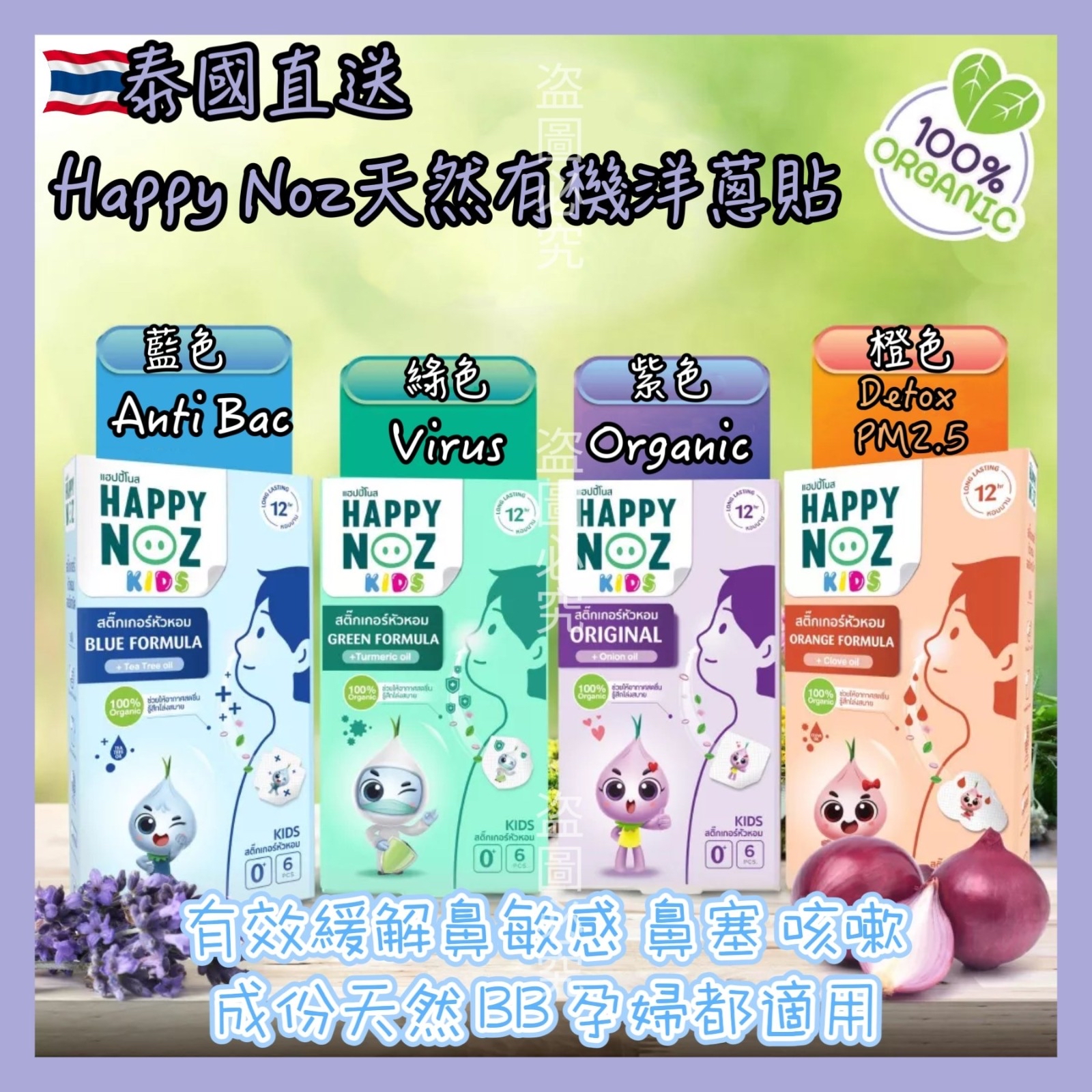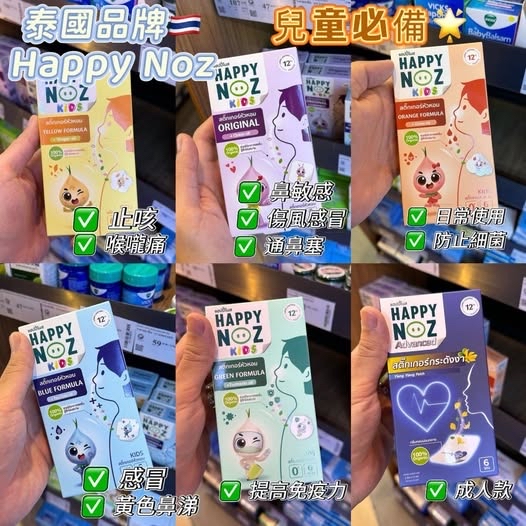 泰國🇹🇭Happy Noz天然有機洋蔥鼻敏感貼 ⛔截單時間:2025-12-23 💰$69/盒;2盒以上$65/盒 📆預計到貨日: 2026-01-02 #超級有效緩解鼻敏感 ✅👃鼻塞/ 咳嗽 #令呼吸道暢通💓 泰國🇹🇭洋蔥貼可以貼在小朋友衣服上😘有效緩解鼻敏感,鼻塞丶咳嗽和令呼吸道暢通🌸 😍味道清新,幫助放鬆✨舒適睡眠🌹成份全天然,BB、孕婦都用得🥳有淡淡的洋蔥味,非常醒神🌈 💡A) Organic (紫色)💜 成份:紅洋蔥、薄荷、薰衣草、尤加利 鼻敏感人士救星,殺菌、舒緩鼻敏感、通鼻塞 💡B) Detox PM2.5 (橙色)🧡 成份:洋蔥、薰衣草、桉樹 、薄荷、丁香 有效防禦空氣中的病毒、有毒灰塵PM2.5懸浮微粒等 大大減低引發傷風、喉嚨痛、鼻水、咳嗽等病徵 💡C) Anti Bac (藍色)💙 成份: 洋蔥、薰衣草、桉樹、薄荷、茶樹油 有效抵抗肺炎鏈球菌、支氣管炎、鼻竇炎、肺炎、中耳炎的細菌及病毒 💡D) Virus+ (綠色)💚 成份: 洋蔥、薄荷、薑黃、桉樹油、薰衣草 幫助預防和舒緩鼻塞,防止病毒,提高整體免疫力 結合姜黃粉強大的抗氧化劑和免疫增強劑的力量 💡E) Yellow Formula (黃色)💛 成份:紅洋蔥、薰衣草、尤加利、薄荷、生薑 有助於止咳、祛痰、減少肺部發炎,幫助擴張支氣管,讓呼吸更順暢🥰 ✅氣味溫和清新 ✅100%天然草本成分 ✅無添加 ✅功效長達6小時 🚨使用方法: 💁🏻♀️可貼於布料上、窗邊、也可貼在口罩衣服、手袋、背囊、睡枕等有需要的地方 規格:1盒6貼 ⚠️注意:G6PD人仕(蠶豆症)不適用