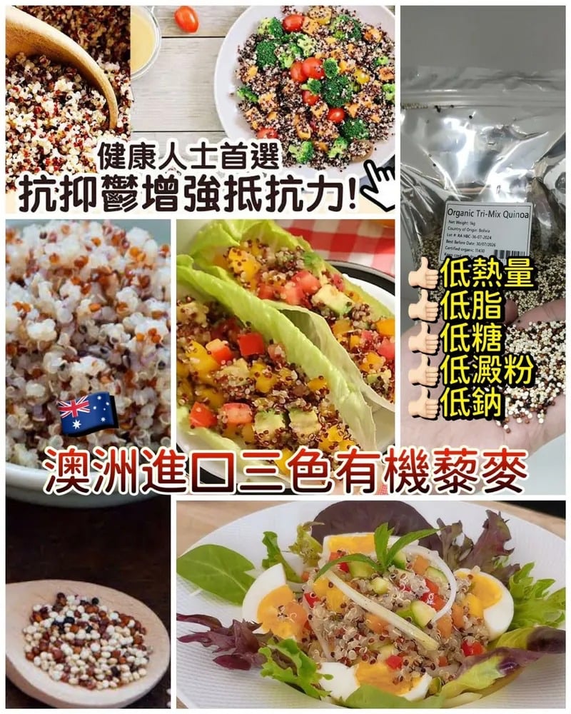 【澳洲直送 有機三色藜麥 1kg】 ⛔ 截單時間:11月25日 💰 $99/包;2包或以上$95/包 📆 預計到貨日:12月下旬 超級食物 ❤藜麥❤ 小小種籽大大驚喜😍 低熱量🔻低脂 🔹低糖 🔸低澱粉 🔻低鈉 ⚪白藜麥:淡淡香草味,似芝麻咁鬆脆 ⚫黑藜麥:甜甜的,口感煙韌 🔴紅藜麥:纖維最高 😍世上真係有一種食物係完美、樣樣營養素都有齊?聯合國糧食及農業組織將一種叫藜麥(Quinoa)既食品列為完美營養食品,深受「有營人士」追捧,香港都有得賣,究竟藜麥係乜東東?有幾完美令美國宇航局都用於太空人既太空食品? 💋藜麥被稱為「營養黃金」✨由於其具有獨特、豐富、全面既營養價值,被古代印加人稱之為「糧食之母」👩🏻符合人類對食品——安全、健康、營養🍳天然既需求 💃🏻超級多明星都係靠佢黎減肥瘦身🙋因為營養極好👏🏻食少少已經足夠身體每日所需,仲要夠飽肚🤲可以代替米,可以煮飯、煮粥、整🥗沙律、整甜品🍧味道有D似芝麻,香口又好食😋 ⭐藜麥可以幫助減肥塑身⭐ ✅藜麥係一種完全蛋白,節食既同時可以獲得足量既礦物質及富含各種營養物質及維生素。藜麥經過蒸煮後體積增大3-4倍😜會比食用標準的減肥食品更飽 ⭐美容聖品⭐ ✅含錳量高,抗氧化能力強。可調節血糖水平、激發酶的活性、分解脂肪 ⭐藜麥是孕婦嬰幼既優質營養源⭐ ✅蛋白質含量可以同肉類媲美。含有9種身體自身不能合成既胺基酸,對於孕期反應嚴重,厭倦油膩和肉食,喜歡清淡素食的孕婦,藜麥絕對是最佳選擇 ⭐小朋友多吃藜麥可提高免疫力⭐ ✅富含鋅元素,鋅是一種生命元素,對小朋友老人家尤其重要 ⭐二型糖尿病及高血壓病人既福音⭐ ✅由於富含鎂元素,可以緩解血管壓力。研究證實,規律性食用藜麥可減少二型糖尿病既發生,同時助老人保持心臟健康,降膽固醇及血糖 ❌無人工香料 ❌無人造色素 ❌無防腐劑 ✔煮法好簡單✔ ❤藜麥可先用開水泡浸約15分鐘,加入紅米白米放入電飯鍋按正常煮法。也可以明火用水煮,藜麥煮大概十一、二分鐘左右,滾到爆開外皮就可以 ❤營養師推介:可以用鐵鑊就咁烘,烘到好似爆谷咁,好脆,可以灑落啲食物度,又可以加落餅乾、蛋糕放入焗爐焗,亦可以加咖喱汁或者茄汁煮,會好入味 📍 包裝以出貨為準 規格:1kg 保存期:2026年10月或之後