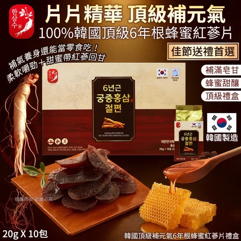 韓國🇰🇷直送@限時預購🔛頂級補元氣6年根蜂蜜紅蔘片禮盒 (1盒10包)