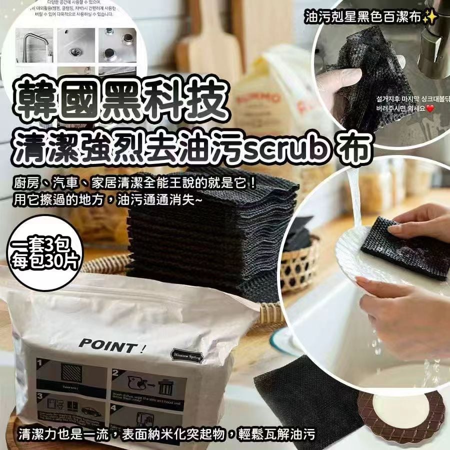 韓國🇰🇷黑科技清潔強烈去油污scrub布(一套3包) ⛔截單時間:2025-11-06 💰$79/套;2套以上$75/套 📆預計到貨日: 2025-12-31 就黎減完~~本年最後一團 油污剋星黑色百潔布✨ 廚房、汽車、家居清潔全能王說的就是它!用它擦過的地方,油污通通消失~ 它是韓國黑科技抹布,銷量超百萬袋!🔥🔥🔥 採用熔噴技術高溫高壓制成,輕薄卻高密度,厚度加倍,耐用性強 複雜纖維結構像網,吸水耐磨,兩面都好用,洗完沒異味 而且材質超讓人安心,無熒光劑、重金屬,還通過有害物質檢測,接觸餐具也不怕 “用完即棄”的理念太適合我這種懶人,每天一張,乾淨又衛生,避免細菌滋生。一袋30片能用很久 清潔力也是一流,表面納米化突起物,輕鬆瓦解油污 一元硬幣大小洗潔精,就能搓出綿密泡沫 洗餐具、擦家電、洗車……一張搞定各種角落。 一套3包 每包30片