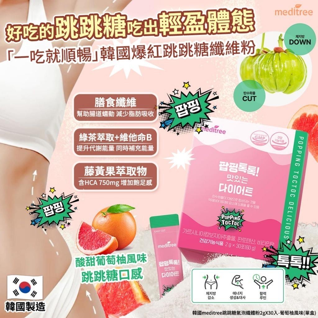 韓國 Meditree 跳跳糖氣泡纖體粉 (1盒30包) 💰$99/盒 ⛔截單日期:2025/10/28 📦預計貨到日:2026年1月中 ✨韓國爆紅!✨ 想要輕鬆管理體重,又不想放棄美味? #Meditree跳跳糖氣泡纖體粉是你的最佳選擇! 嘴裡像跳跳糖一樣「咻咻爆開」的氣泡感, 讓你一邊喝、一邊覺得好療癒 ✔膳食纖維幫助腸道蠕動,減少脂肪吸收 ✔綠茶萃取+維他命B提升代謝,同時補充能量 ✔藤黃果萃取物含750mgHCA,增加飽足感 🍊酸甜葡萄柚風味,清爽又美味! 每盒30入,方便攜帶,一天一包,輕鬆養成健康習慣! 可直接吃或是加入水💧即可享受氣泡感十足的美味飲品 讓你在忙碌生活中也能輕鬆管理體重,保持輕盈體態! ✨💬 團媽已實測超愛:「真的好喝又順!」 一起養成每天一包的小習慣~ 讓氣泡的清爽感,陪你維持最輕盈的狀態🎈 這樣吃/喝更有效! 📌 每日 1~2 次 📌 餐前或餐後 30 分鐘內吃或飲用皆可 📌 可依個人喜好加入冷水或氣泡水 💧 建議飲用方式 將粉末倒入約 200~300ml 水中 充分攪拌後即可飲用 建議用冷水飲用,氣泡感更明顯 ✨ 💬 小提醒: 飲用後請立即補充足量水分 持續飲用 2 週以上效果更明顯 兒童、孕婦、哺乳婦請依醫師建議使用 -規格:1盒30包,每包2g (葡萄柚風味) -產地:韓國 ==⚠️ 聲明 ⚠️== 1.本貨品為平行進口正貨。 2.所有帖文內容只作分享及參考用途。為免混淆視聽,所有商標或版權均屬有關商品品牌商標的持有人,敬請留意。 3.空運/海運有可能因各種不明因素影響而延誤到貨,所有貨品一經訂購後,如非廠家缺貨,不設取消/退貨/換貨。 4.貨品在運輸途中導致產品包裝外盒有任何損毀凹陷,但不影響其產品本身食用/使用,或有機會不預設外盒出貨,我司不會作任何更換或退款。 5.以上資料及外盒包裝只供參考,商品外盒原廠有更換新包裝權利,一切以實物為準。 6.顏色或因拍攝器材或顯示螢幕等因素而與實物有異,以上圖片及文字僅供參考,一切以實物為準。