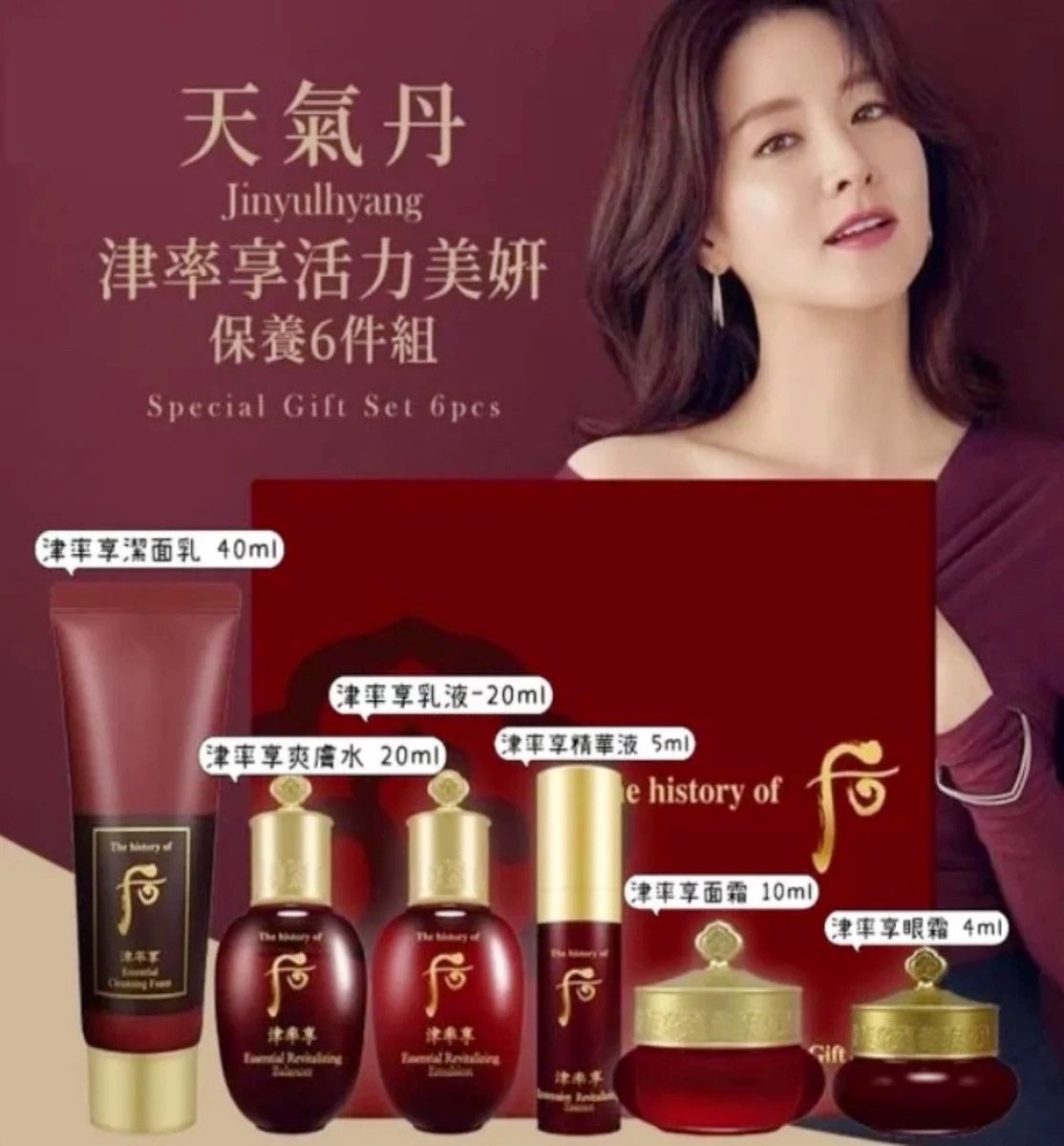 韓國Whoo后津率享紅潤美妍6件組* ⛔️截單日期:10月19日 💰$139/套,2套以上135/套 📆 ✈️📦預計到貨日期:12月頭中 韓國Whoo后津率享紅潤美妍6件組 🔻6件組包括🔻 ✅津率享精華液 5ml ✅津率享眼霜 4ml ✅津率享爽膚水 20ml ✅津率享面霜 10ml ✅津率享滋養乳20ml ✅津率享潔面乳 40ml 👑韓國天后也愛的頂級保養品牌👑 Whoo后🔥天氣丹津率享系列 以韓國傳統宮廷秘帖 💜養出極致好氣色😉 這套✨紅潤美妍組合✨ 針對調節女性乾枯的精氣神 使用精選的紅蔘🌸珍貴配方 ✅細緻柔滑 ✅改善粗糙 ✅水潤活力 ✅提亮光采 給予肌膚全方位的滋養呵護👍🏻肌膚持續飽滿潤澤 一套就能享受💎貴婦級的保養🥰🥰 == ⚠️ 聲明 ⚠️== 本貨品為平行進口正貨 所有帖文內容只作分享及參考用途。為免混淆視聽,所有商標或版權均屬有關商品品牌商標的持有人,敬請留意 💢 顏色或因拍攝器材或顯示螢幕等因素而與實物有異,以上資料及圖片只供參考,一切以實物為準。 由於廠商更換包裝或不會另行通知我司,而包裝並不影響內容物及其品質與使用體驗,因此恕不因包裝與圖片資料不一而作出退換。 💢貨品在運輸途中導致產品包裝外盒有任何損毀凹陷,但不影響其產品本身食用/使用,或有機會不預設外盒出貨,本司不會作任何更換或退款,介意慎購! 💢外國進口貨品之貨期或受船運/空運延誤影響,恕不接受貨期延誤原因取消訂單,下單前敬請諒解